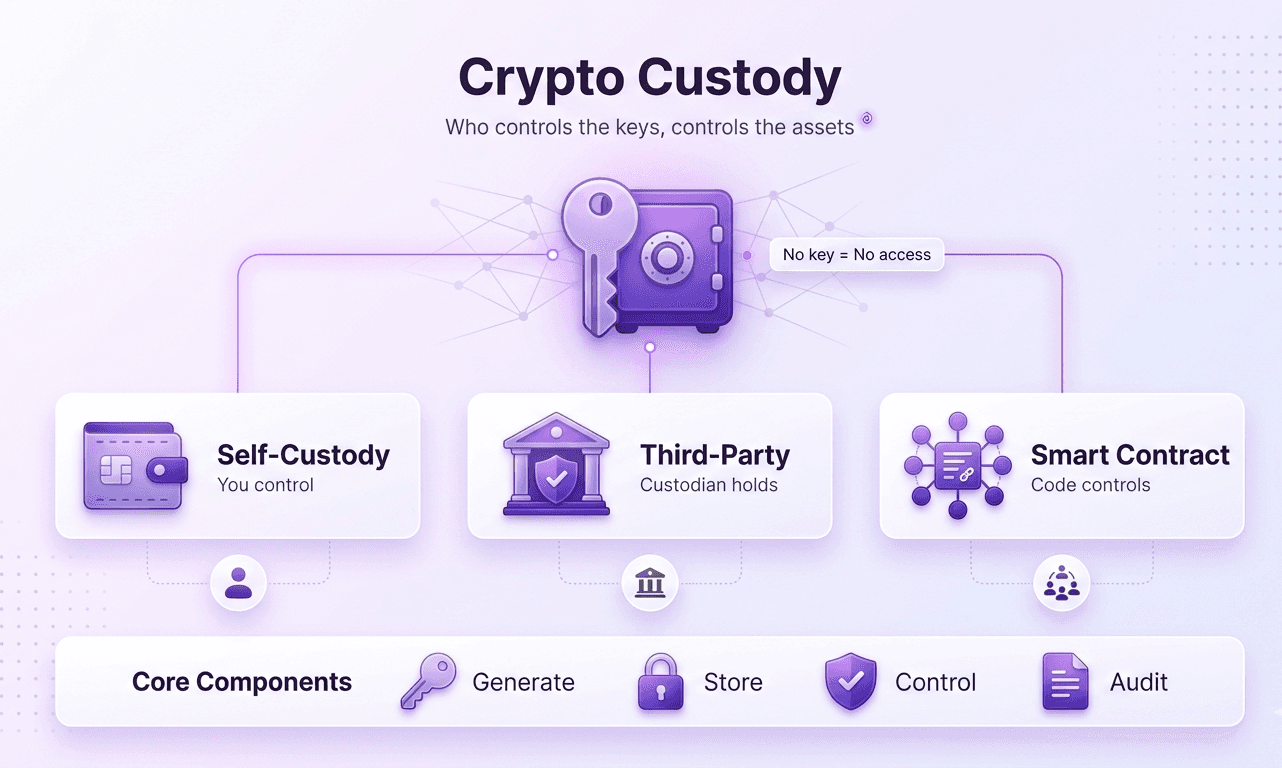 Crypto custody is the secure storage and management of private keys. Whoever holds the private key controls the asset. Lose the key and the funds are gone. There is no password reset. There is no bank to call.