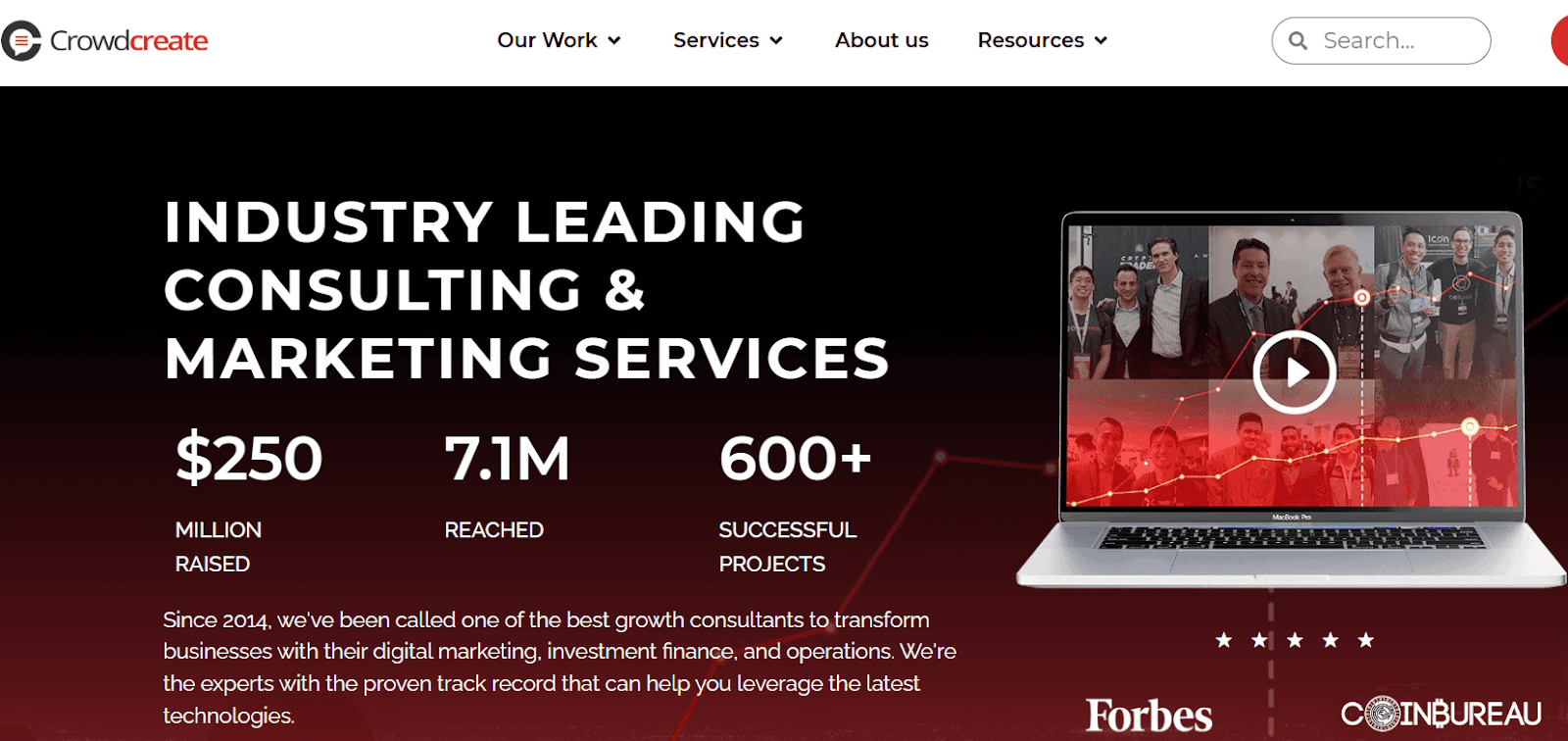 Crowdcreate is one of the longest-running crypto marketing agencies in the world. Founded in 2014, the firm has worked on 600+ projects. Their LinkedIn and Clutch pages confirm over $250 million funded across multiple industries.