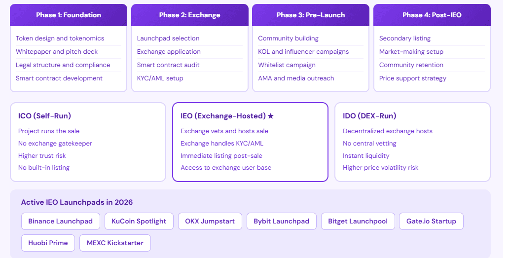 IEO development covers everything a project needs to reach that exchange launch: