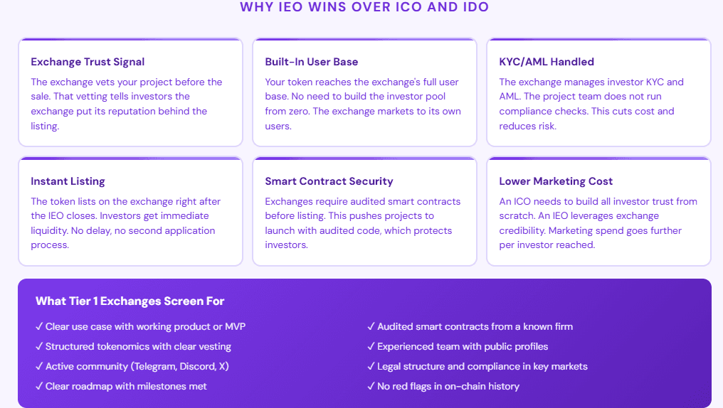 An Initial Exchange Offering is not just a token sale. It is a credibility signal. The exchange vets your project before the sale opens. It handles KYC/AML. It gives investors a liquid market the moment the sale closes, as mentioned in this IEO development guide. That vetting is what separates an IEO from an ICO. Serious investors see the difference.
