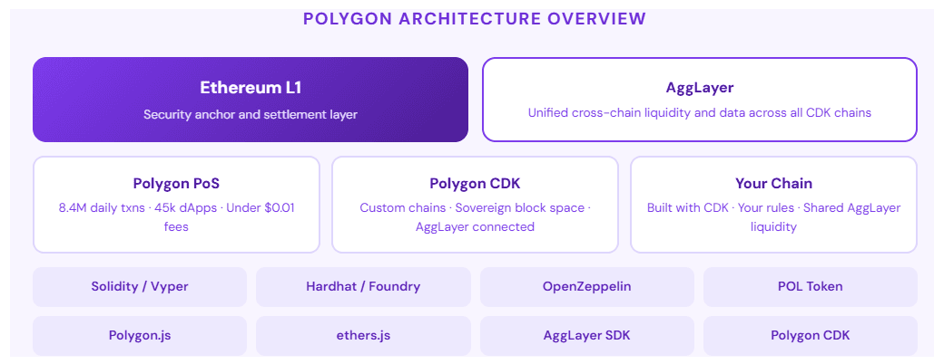 Builders choose between two main paths. Deploying on Polygon PoS gives access to 45,000+ dApps and deep liquidity. It holds the biggest stablecoin base on any L2. Building with Polygon CDK gives sovereign block space. It connects to the AggLayer for cross-chain liquidity and data.