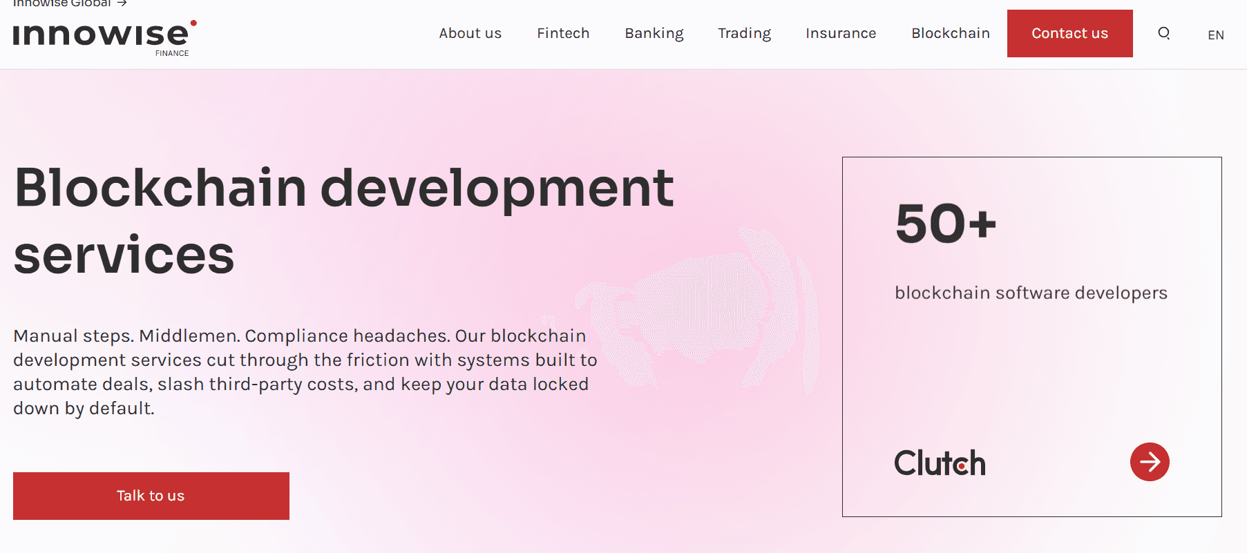 Innowise is the biggest firm on this list. They have 3,500+ staff and a blockchain team of 50+ developers. They hold CMMI Level 5 status, the top rating in software engineering process maturity. Smart contract work covers design, build, audit, and performance tuning.