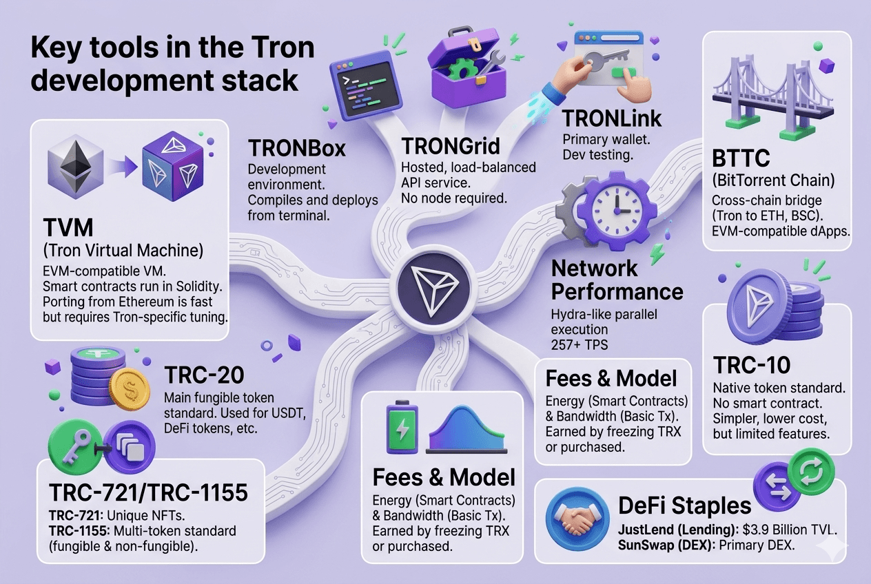 Building on Tron means one of two paths: deploying TRC-20 or TRC-721 smart contracts on the live Tron network, or building deeper integrations with the Tron protocol itself for payment rails, node infrastructure, or custom DeFi protocols. Both paths share the same core tools.