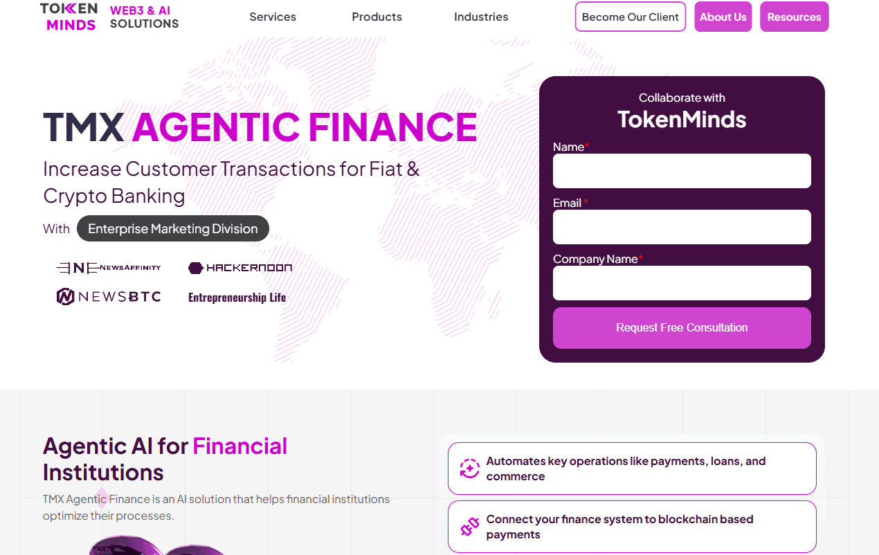 TokenMinds uses three core products for Tron-based builds. TMX Payment enables compliant stablecoin transfers, multi-network settlement, and backend integration with existing finance systems. TMX Tokenize provides controlled issuance for TRC-20 and TRC-721 assets, with rules enforced at the smart-contract level. TMX Agentic Finance adds automated treasury management, including monitoring, approved execution flows, and anomaly detection. In production environments, this stack has reduced settlement latency from 18h → 45s using TRC-20 rails + batch settlement layer, and energy consumption reduced 42% after TVM opcode optimization.