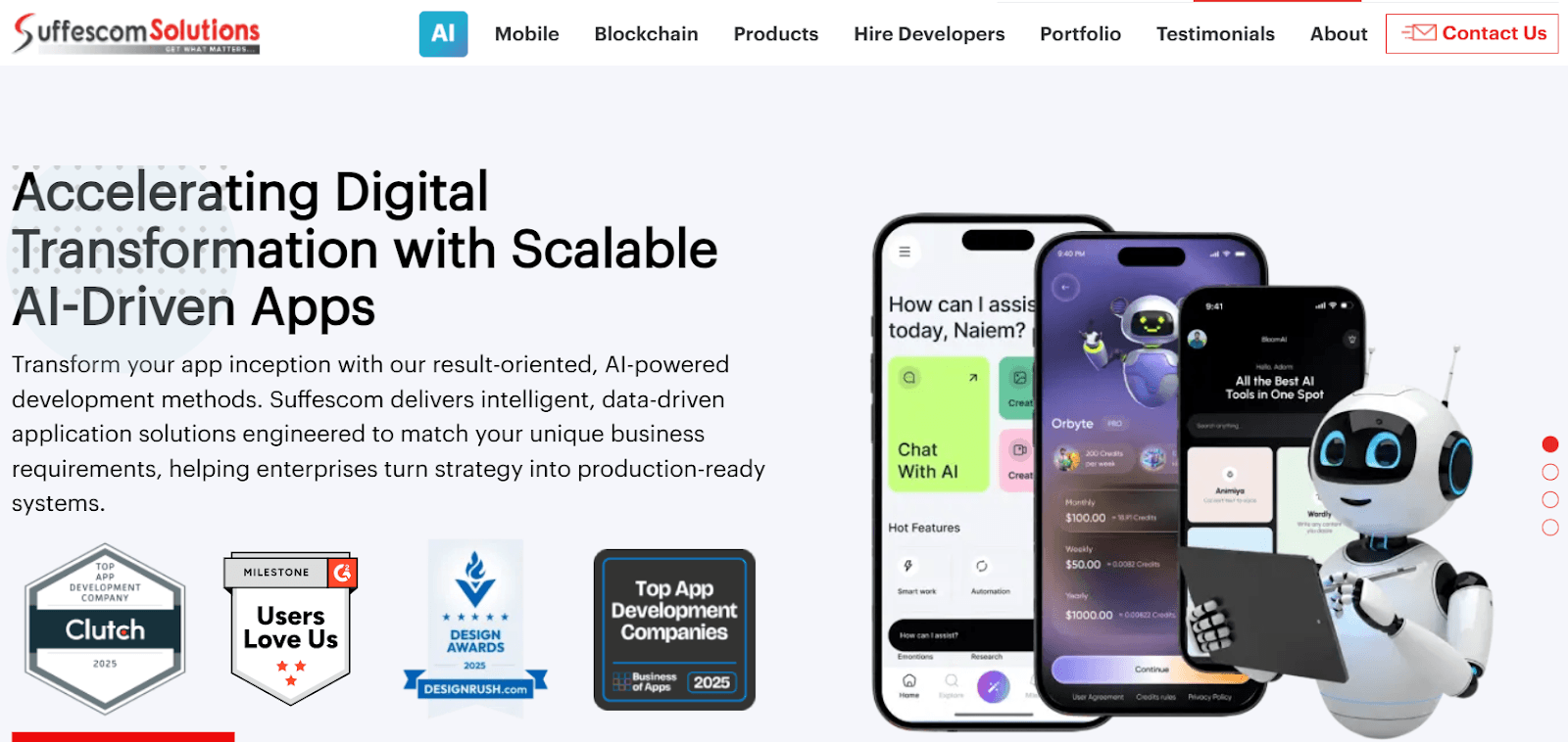 Confirmed awards: Clutch Global Award Spring 2024, G2 Grid Leader Spring and Winter 2025, and 7th on Clutch's Top App Development Companies list (December 2025).