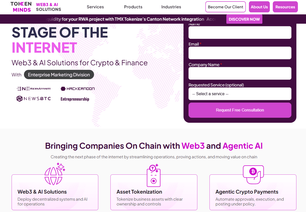 Three live products power every TokenMinds engagement. TMX Payment handles multi-network transfers, KYC/AML compliance, stablecoin settlement controls, and ERP sync, all on a single platform. For TRON builds, TMX Payment turns TRC-20 rails into a full enterprise payment system. TMX Tokenize covers asset tokenization across real estate, commodities, securities, and loyalty programs, built to run on TRON's low-fee token standards. TMX Agentic Finance brings AI automation to on-chain treasury management. It monitors reserves, executes approved transactions, and flags anomalies without manual input. Documented results: 97% KYC completion. Settlement cut from 48 hours to under five minutes.