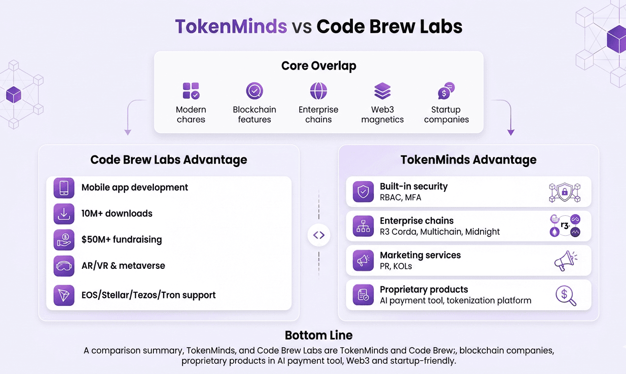 TL;DR: Code Brew Labs suits startups and entrepreneurs that need fast multi-discipline builds at low cost. TokenMinds is a dedicated Web3 firm that builds finance-grade blockchain systems, deploys AI payment tools, and runs the launch alongside the product. It suits institutions, finance teams, and Web3 projects that need compliance depth and go-to-market support in one place.