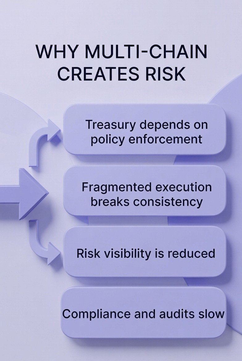 Traditional treasury models assume a single system of record, but multi-chain operations fragment assets, approvals, and visibility. This breaks unified governance, increases manual work, and makes real-time risk and compliance oversight extremely difficult.