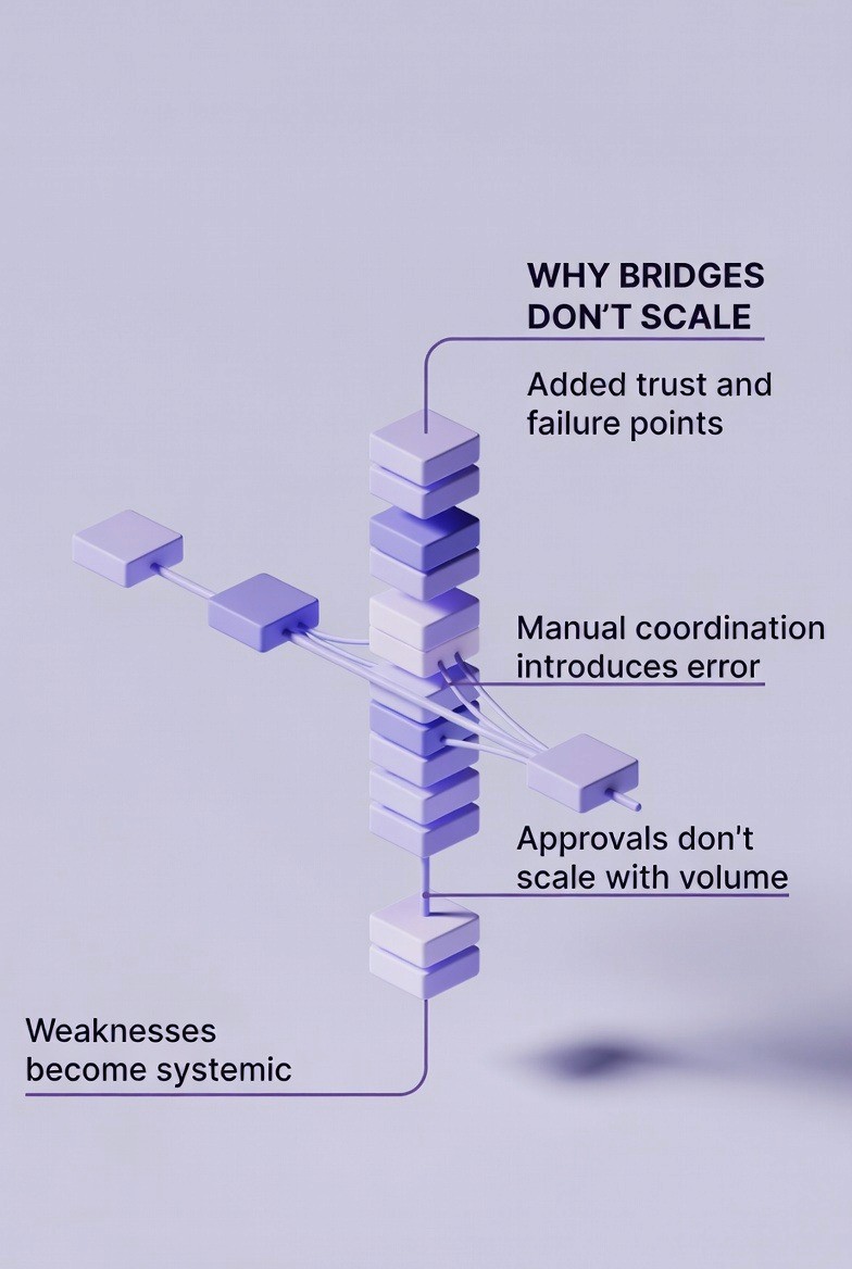 Manual approvals do not scale beyond a few chains and introduce human error, while bridges add systemic security risk and operational bottlenecks. As transaction volume and chain count grow, these weaknesses become structural failures rather than isolated issues.