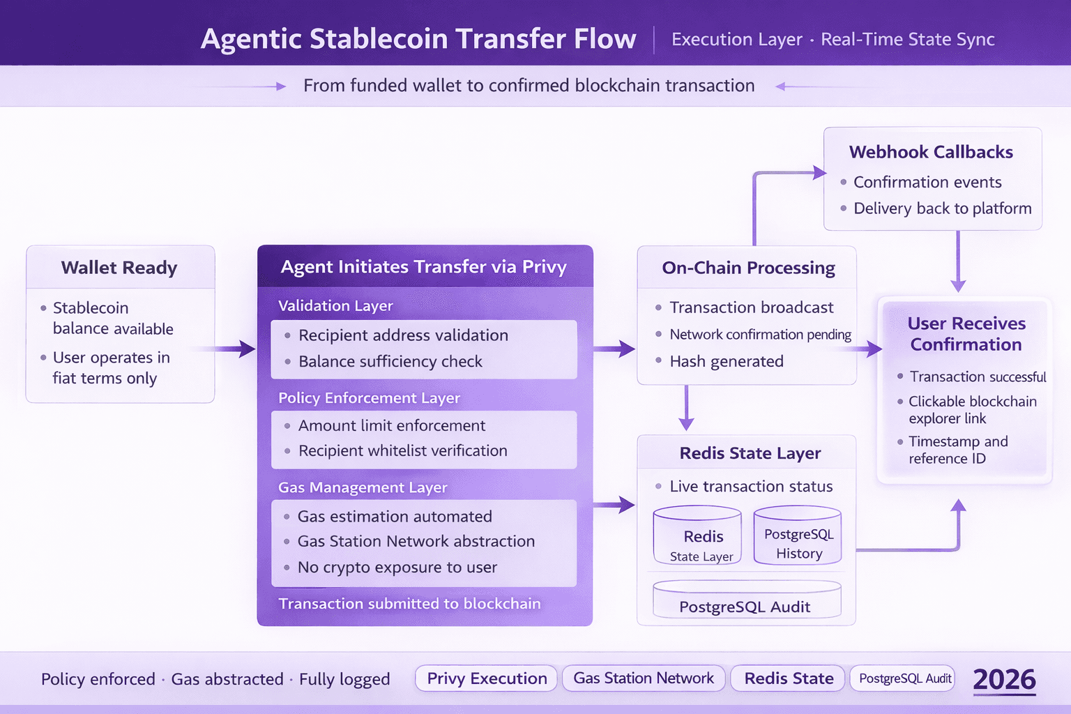 Once the wallet is funded, the agent uses Privy to execute the blockchain transfer. The agent checks that the recipient address exists, that there are sufficient funds available in the sender’s account, that it follows all of the configuration defined for transactions (e.g., how much money can be transferred, if the recipient has been “whitelisted” etc.), Privy automatically estimates the gas fees required using the Gas Station Network so that end-users never have to worry about converting between fiat or stablecoin and cryptocurrency, and finally Privy sends the transaction.