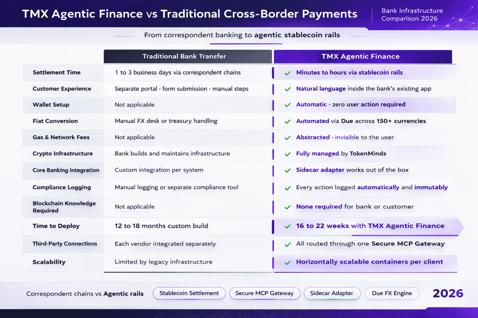 Banks that deploy TMX Agentic Finance can offer cross-border payments through crypto rails without building or managing blockchain infrastructure. The wallet layer, fiat conversion, gas management, custody, and audit logging are all handled by the platform. The bank connects at one point and configures the agent's workflows. Everything else is abstracted away.