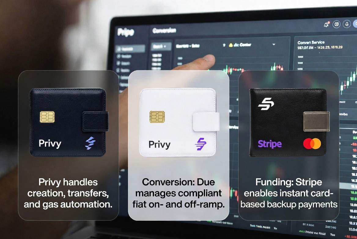 Liquidity risk. Due handles the main fiat conversion. Stripe acts as a backup. The Gateway switches providers automatically if one fails. No manual intervention required.