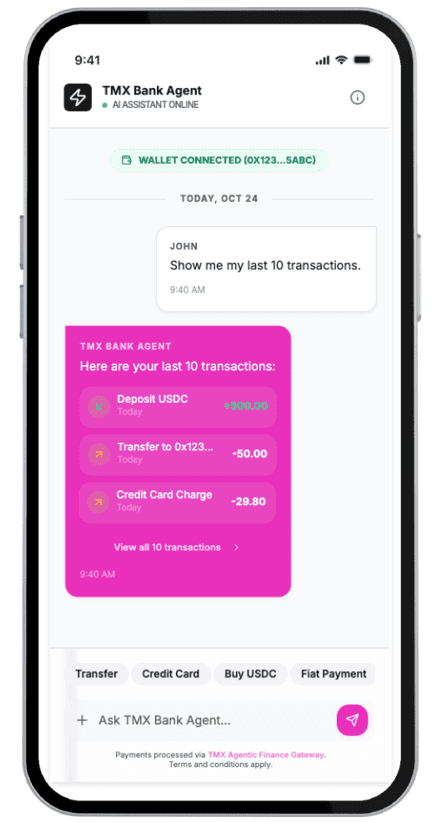 The customer experience is simple. A user types what they want. The TMX Bank Agent reads the request, executes the steps, and confirms when it is done. No separate portal. No manual steps. No blockchain knowledge needed.