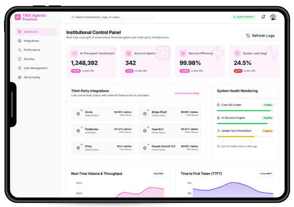 TMX Agentic Finance works within existing laws in each payment corridor. The bank keeps full ownership of its customers and stays responsible for compliance. The platform provides execution and infrastructure. It does not act as a regulated financial intermediary.