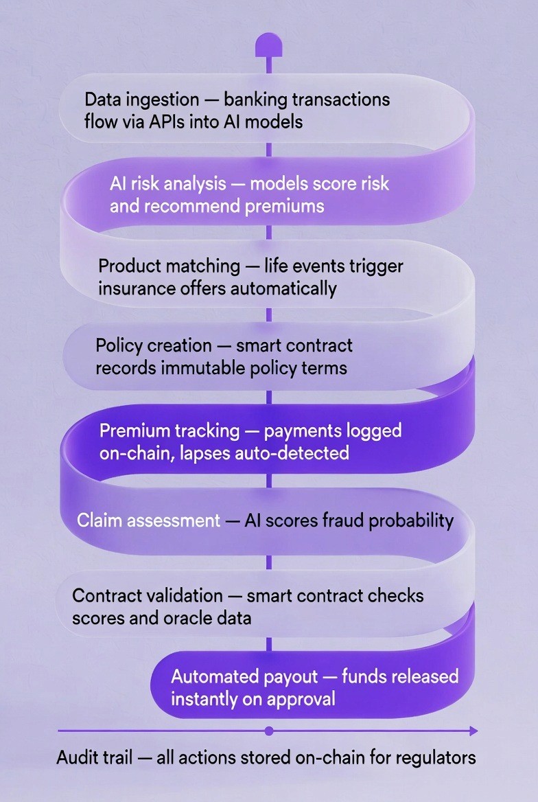 The full technical flow integrates AI and blockchain across the bancassurance lifecycle.