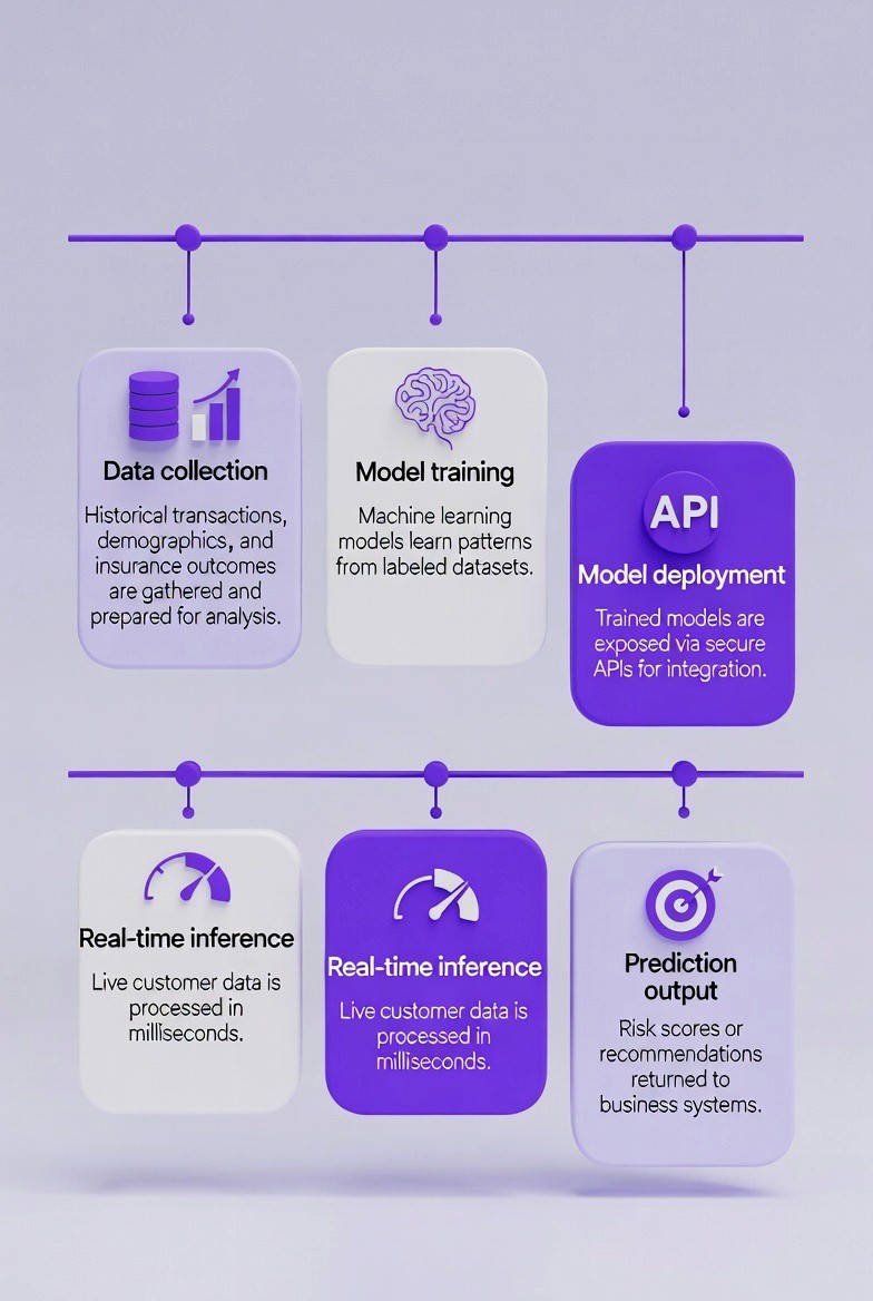 Transaction data from customers is extracted by API or batch files from core banking systems. Once this data has been collected, it is then loaded into a data warehouse, which is processed by machine learning (AI) models that analyze spending habits, income stability, and life events to provide the customer with an appropriate risk score and/or insurance product recommendation.