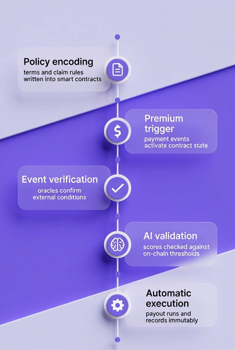 Blockchain enforces the rules by executing the outcome from an AI decision, and it houses all policy terms, tracks all premium payments, verifies each claim, and releases all applicable payouts. Blockchain functions as a distributed ledger where maintaining data integrity and building trust are paramount.
