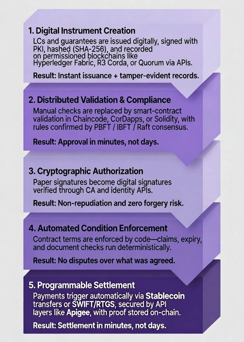 Smart contracts are the breakthrough that transforms bank guarantees and letters of credit. Instead of having people manually verify that conditions have been met, smart contracts do this work automatically, 24/7. A shift increasingly supported by bank-grade stablecoin frameworks like the one outlined in this reference