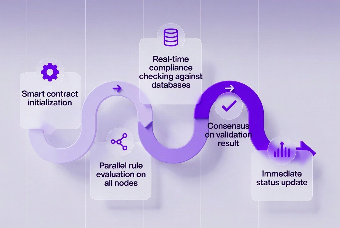 Technical flow: Smart contract initialization → Parallel rule evaluation on all nodes → Real-time compliance checking against databases → Consensus on validation result → Immediate status update