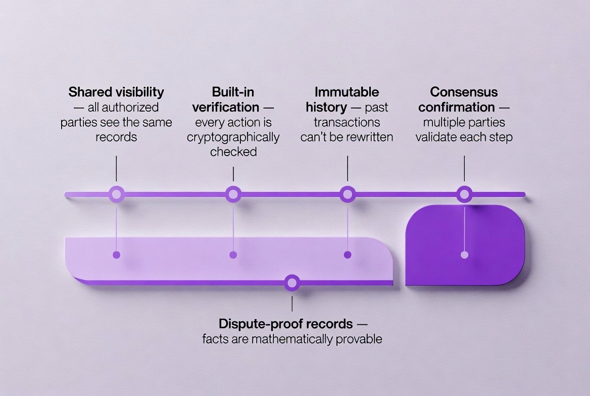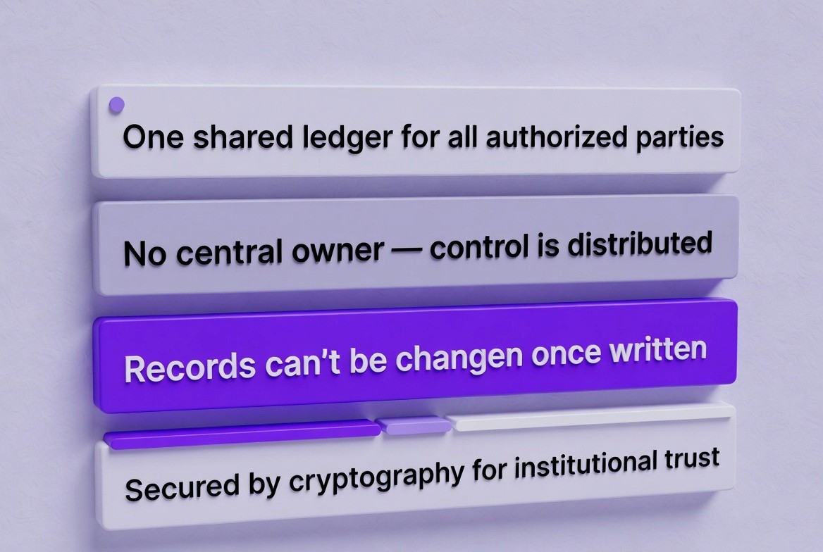 Blockchain is a shared digital ledger that multiple parties can access simultaneously. Think of it as a spreadsheet that is stored on thousands of computers at the same time. No single person or company controls the spreadsheet. Everyone with permission can see the same information. Once something is written into the ledger, it cannot be erased or changed. This immutability is enforced through cryptography, the same technology that protects your online banking, a foundation that becomes especially important in coordinated treasury operations like those described in this approach.