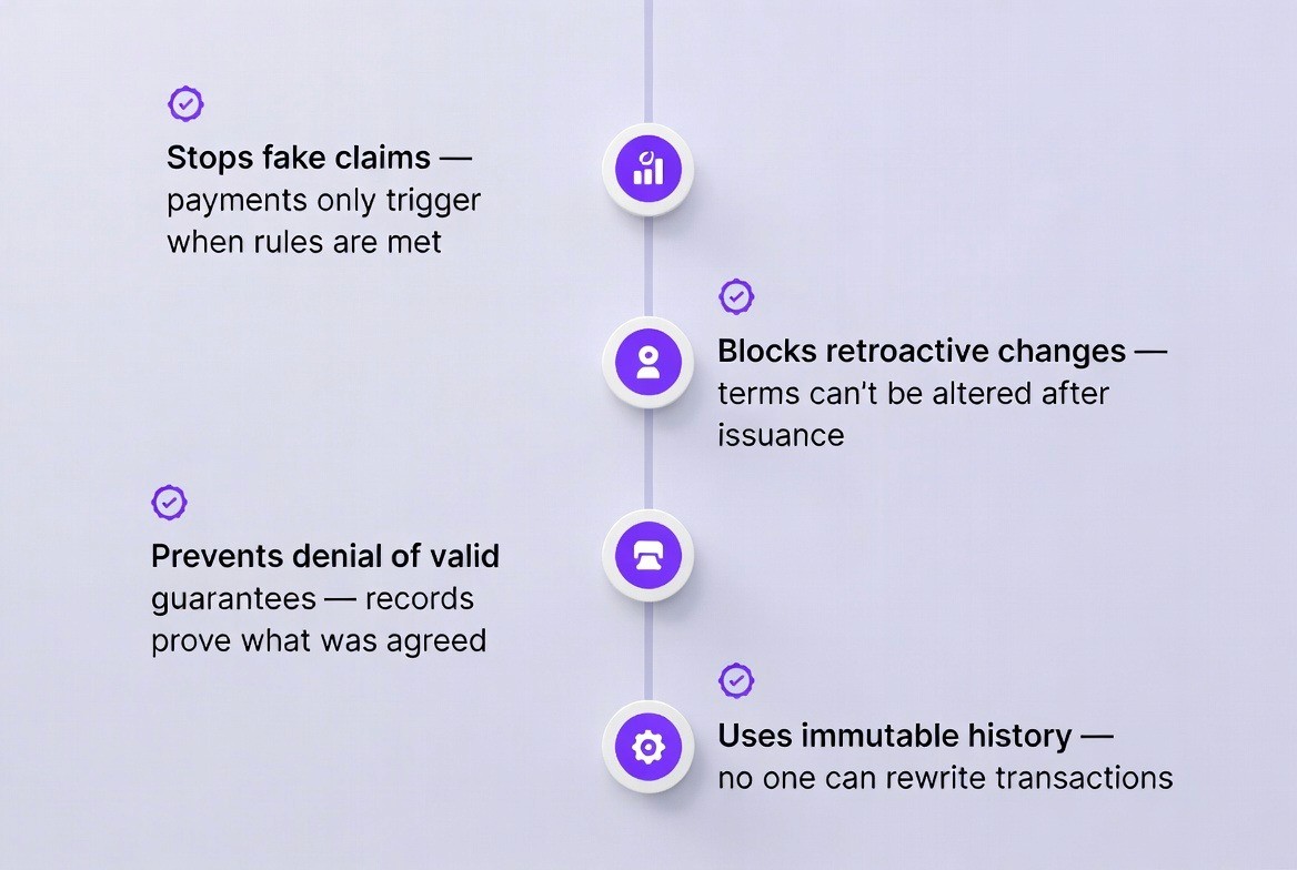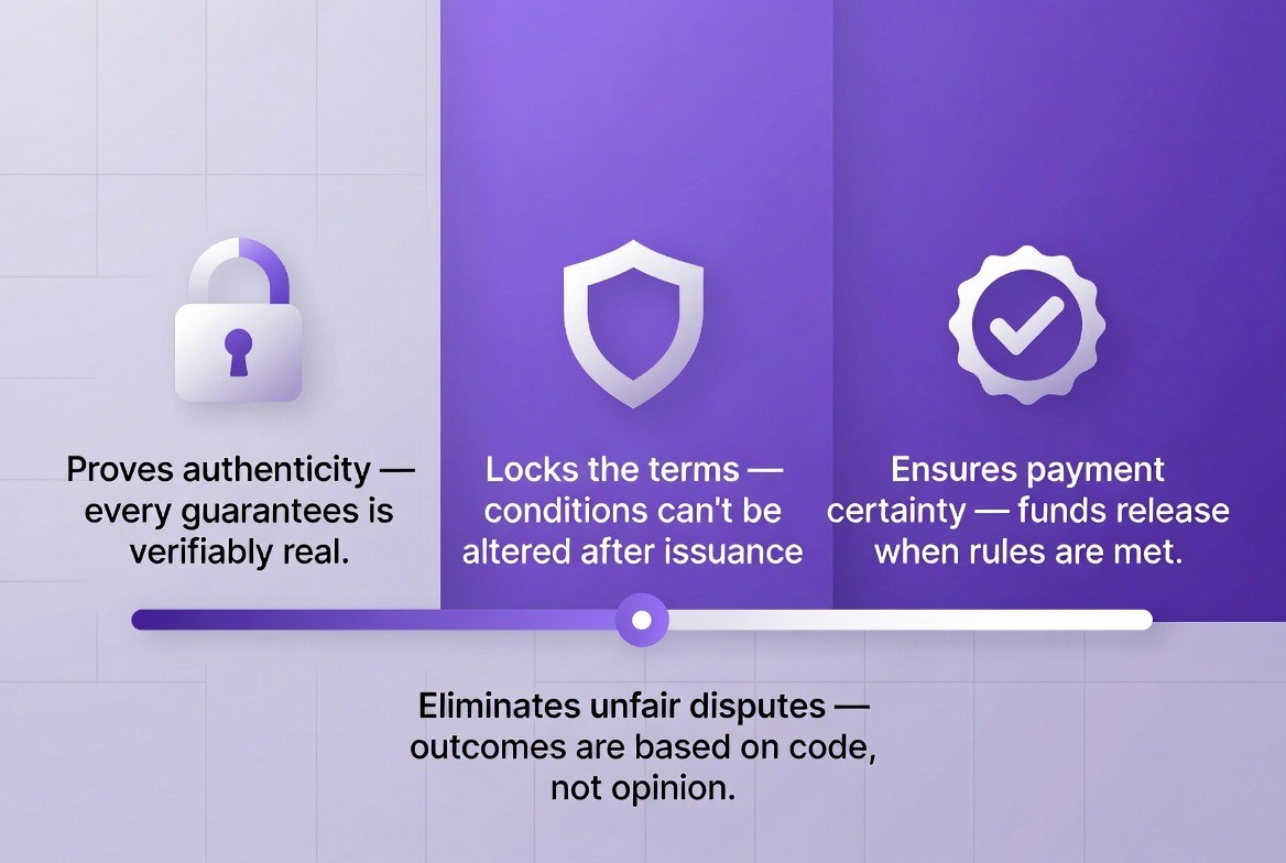Because every document is protected by cryptography, digital signatures, and immutable records. Once a guarantee or letter of credit is issued on a blockchain, it cannot be altered or forged without detection. Fraud attempts such as duplicate claims, fake documents, or unauthorized amendments are automatically blocked by smart contract rules and network consensus.