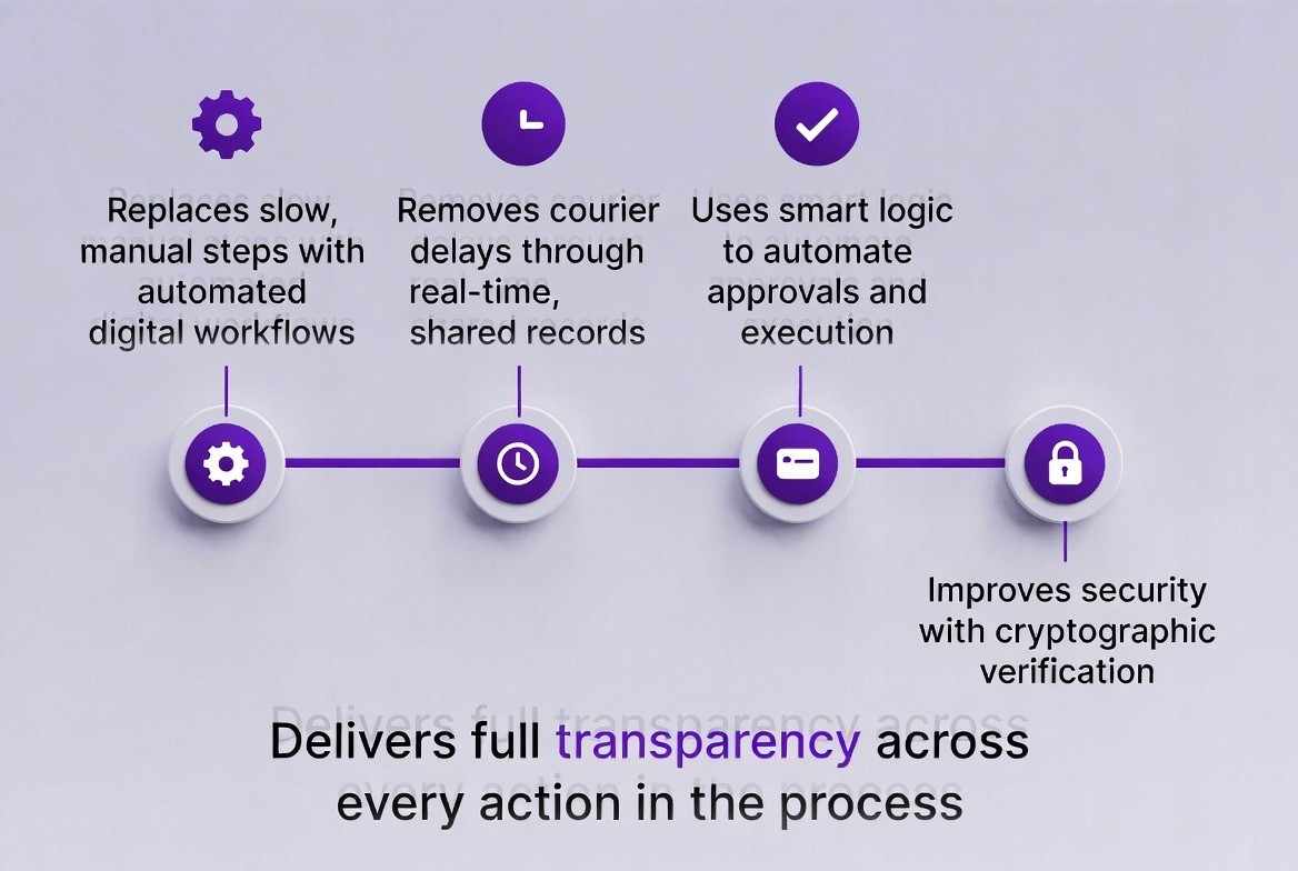 Blockchain replaces manual handoffs with a shared digital ledger and smart contracts that automate validation, approvals, and settlement. Instead of waiting days for document checks and bank confirmations, transactions are verified in real time across all participating institutions, cutting processing time from weeks to hours or even minutes.