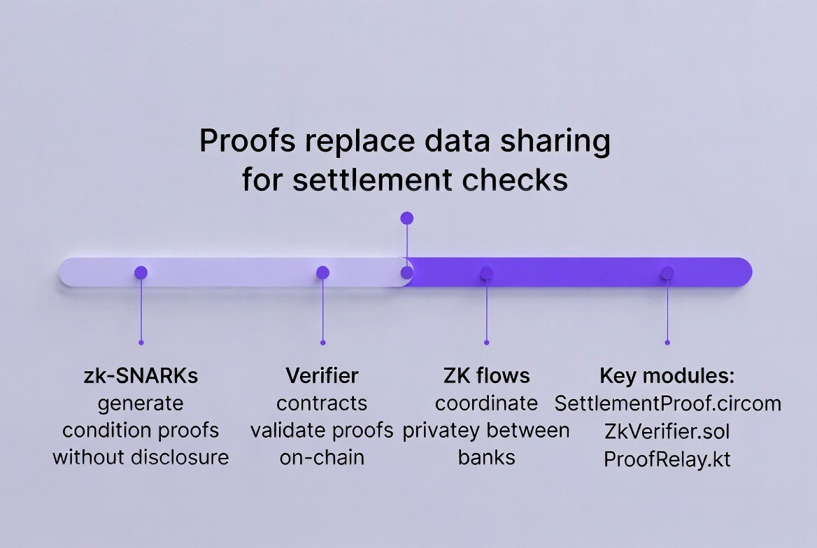 Typical modules used in zero-knowledge settlement validation include: SettlementProof.circom (a circuit written in the circom language that defines proof generation logic), ZkVerifier.sol (a Solidity smart contract that verifies proofs on-chain), and ProofRelay.kt (a Kotlin module in Corda that transmits proofs between banks).