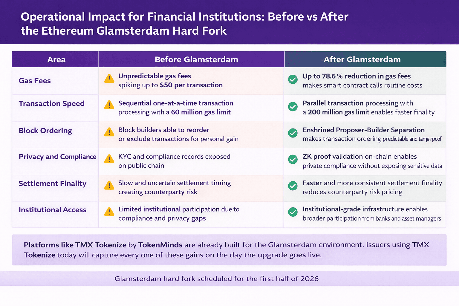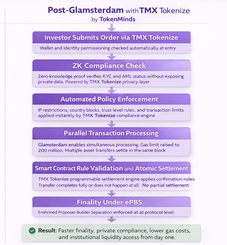 TMX Tokenize enforces settlement at the contract level. A transfer either completes fully or it does not happen at all. No T+2 wait. No partial transfers that leave one side exposed. As Glamsterdam speeds up block processing, TMX Tokenize settlement becomes faster and more reliable at the same time.