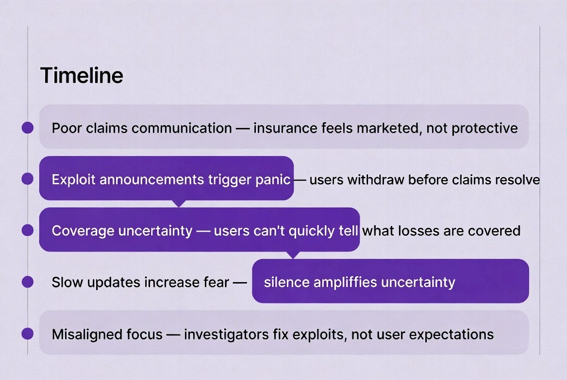 Diagram Description: A timeline showing an exploit event, claim submission, governance delays, treasury pressure, claim rejection, and user exit.