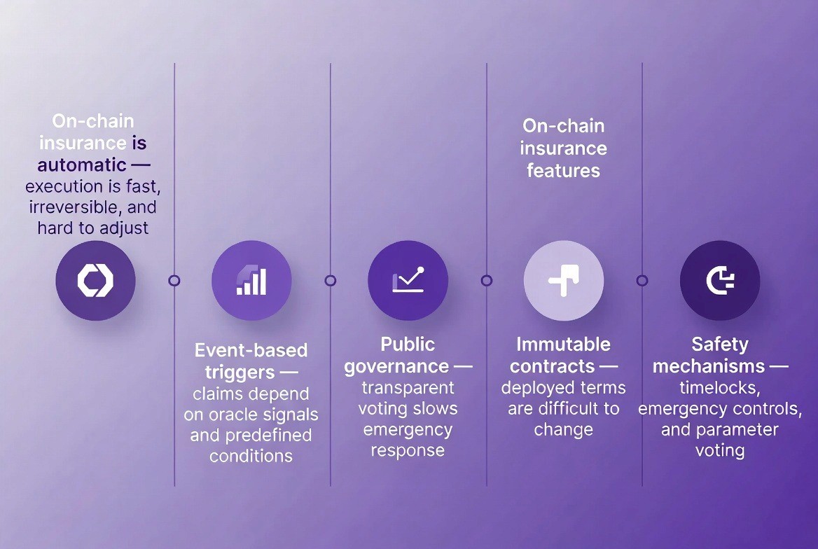 Insurance in DeFi operates through public blockchain networks. The execution of insurance is automatic and irreversible. This facilitates fast processing but also constrains the ability to adjust how a claim is processed.