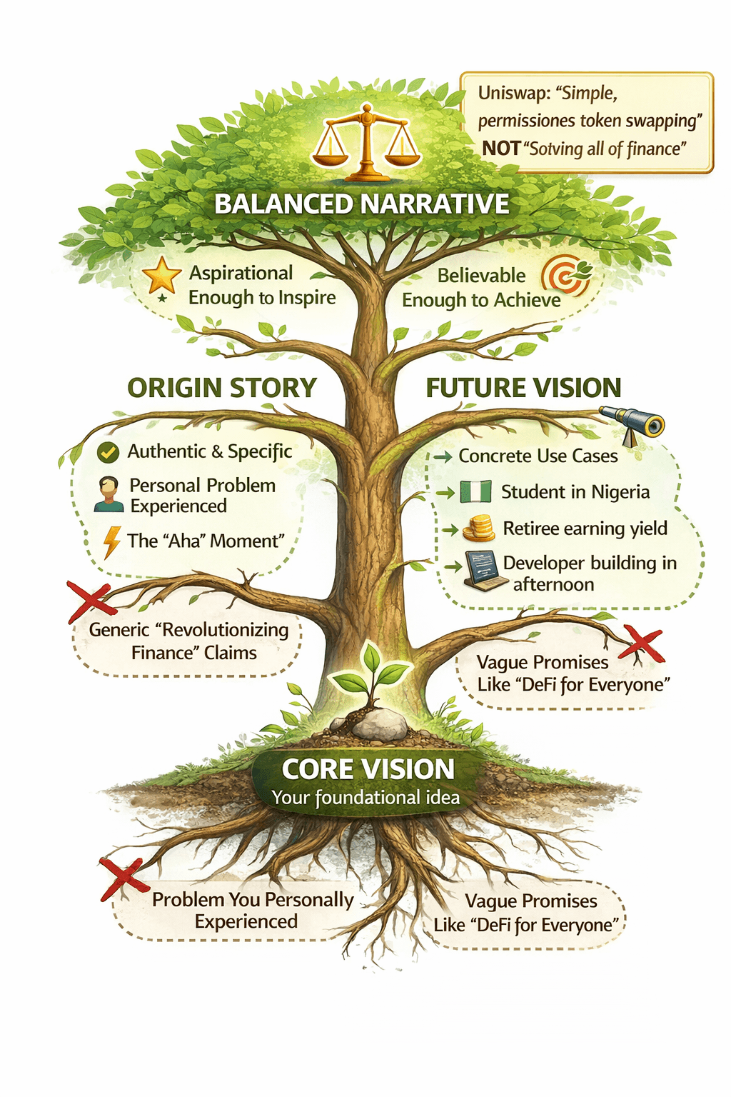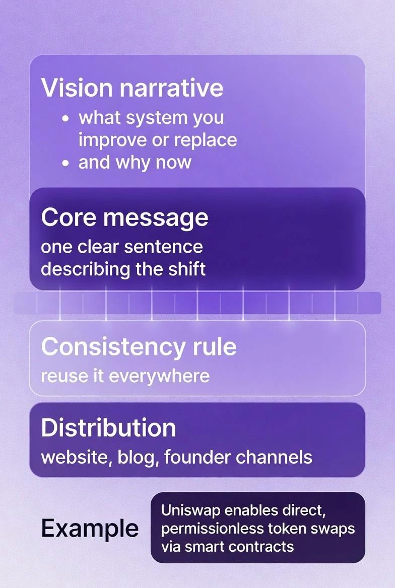 Uniswap followed this pattern. Initially: "swap any token without permission." As the product matured: "open financial infrastructure for all." The vision evolved as they earned the right to make bolder claims.