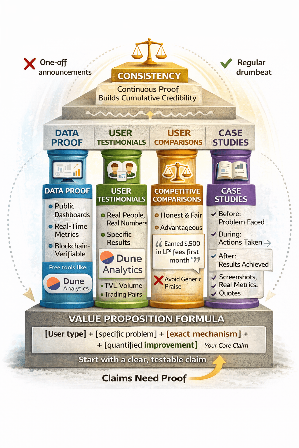 Track Monthly: Measure all metrics, identify weak pillars Dashboard It: Make metrics public (Dune Analytics) Course Correct: Low scores = narrative-reality gap to fix