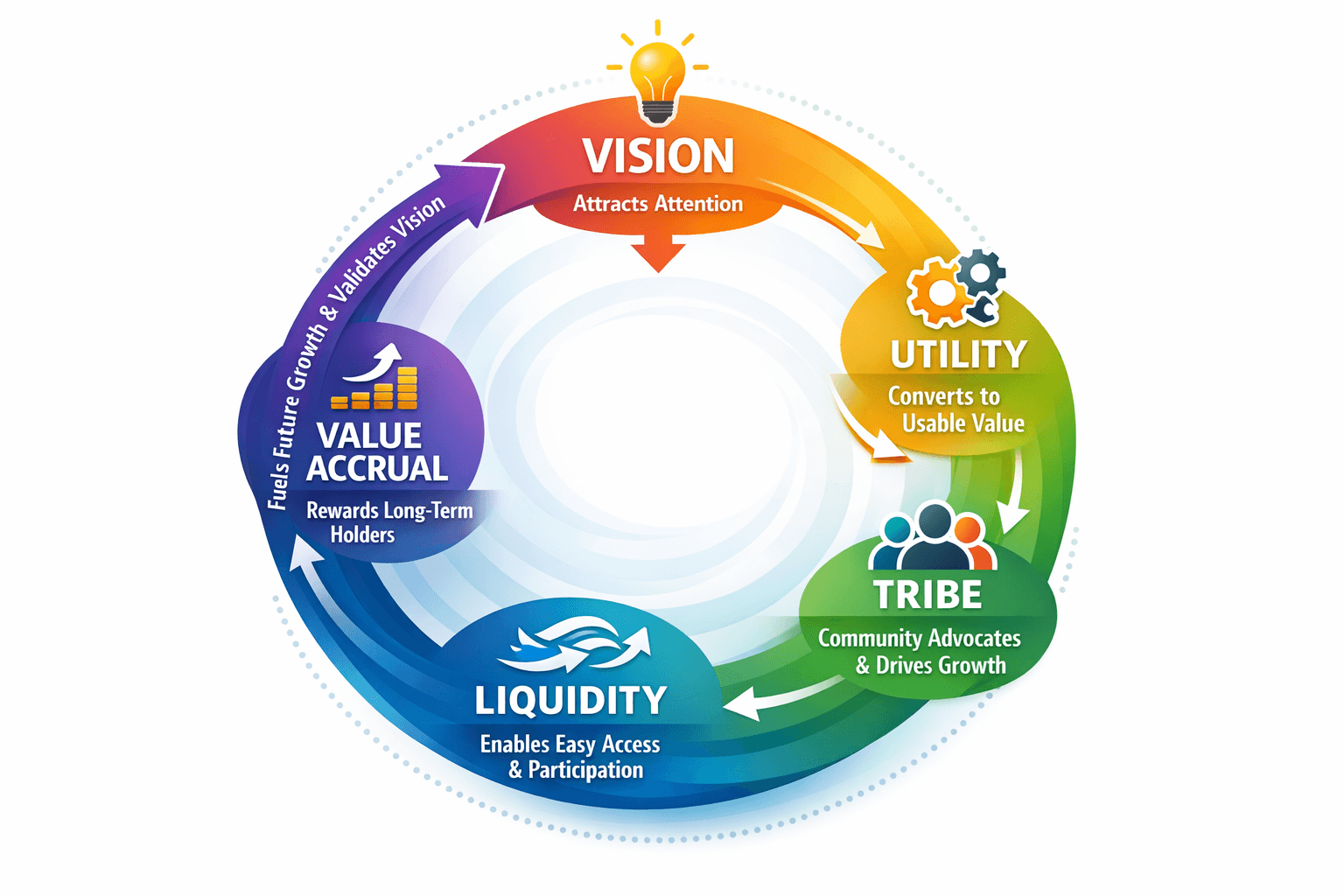 Vision captures attention and differentiates you from thousands of other projects. Utility converts that attention into actual usage by solving real problems. Tribe transforms users into advocates who spread your vision organically. Liquidity ensures easy participation and reduces friction. Value accrual rewards long-term holders who then fund ecosystem growth.