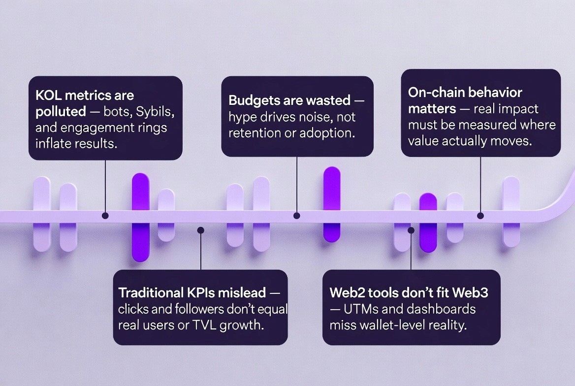 The root of this problem lies in how Web3 marketing still depends on Web2 infrastructure. UTM links, screenshot proofs of reach, and agency dashboards may have worked when the internet primarily used cookies and centralized accounts. But Web3 operates differently. Users control their own wallets, and every transaction leaves a permanent record on the blockchain. The tools marketers use need to match this reality.