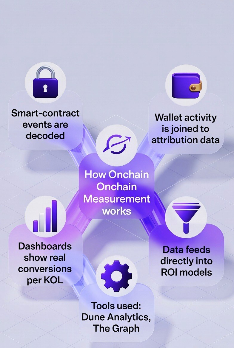 Smart contract events such as swaps, stakes, mints, and deposits are indexed using tools like Dune Analytics and The Graph. These events show exactly what users do after being referred, turning KOL performance into measurable business outcomes.