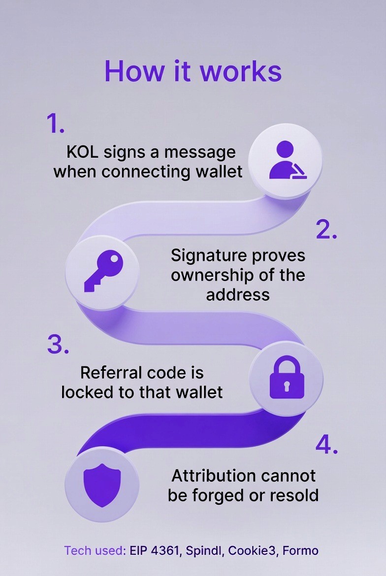 When users connect their wallet through a KOL link and sign with EIP-4361, the referral is cryptographically bound to that wallet. This makes attribution permanent and tamper-proof, eliminating fake signups and multi-account abuse.
