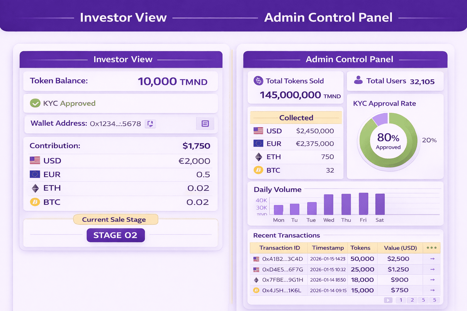 Admins need a unified control panel. TMX TGE covers total tokens sold, total users, KYC approval rates, amounts collected by currency, recent transactions with timestamps and USD values, and a volume graph by day. Every transaction has a unique ID, a timestamp, a token amount, and a USD value. All records are visible, auditable, and exportable in one place.