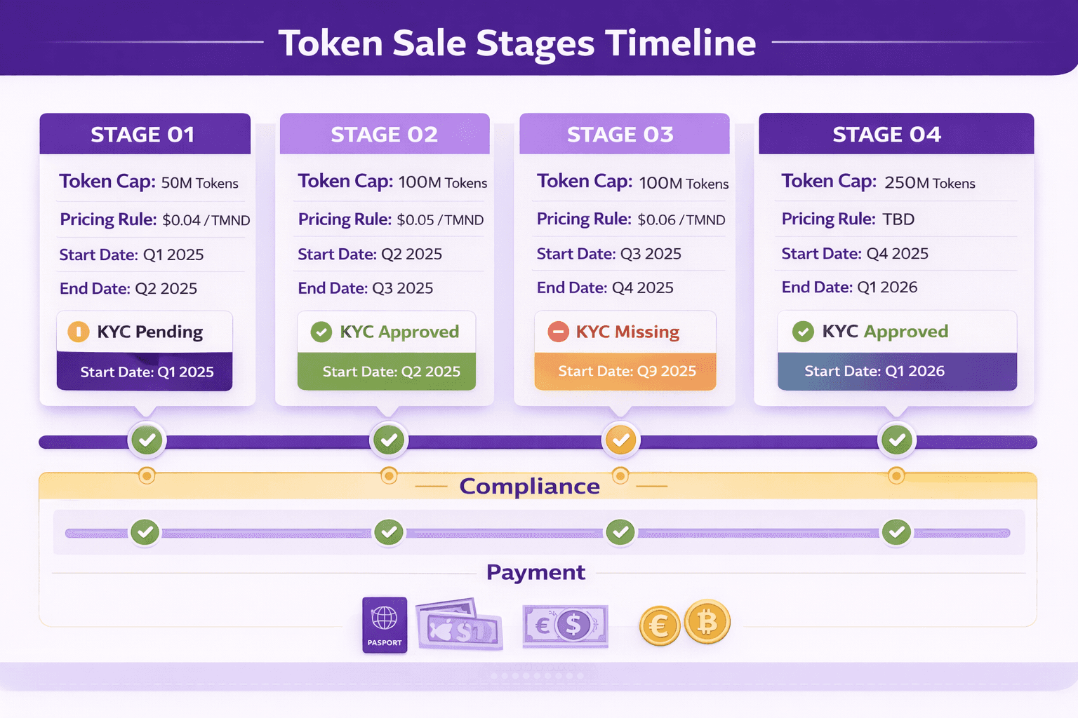 TMX TGE by TokenMinds is a ready-built token sale platform designed for exactly this. It enforces stage-level token caps and contribution limits automatically on every transaction. It integrates a KYC and AML module that verifies investor identity against government-issued documents before any purchase goes through. It accepts both fiat and crypto payments through one gateway. And it logs every transaction with a unique ID, timestamp, token amount, and USD value from day one.