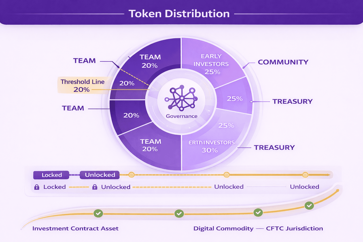 Network Maturity Plan | No plan for the 20% threshold. | Token supply set but no governance plan. | Distribution planned. Governance structure being designed. | Tokenomics designed so no single entity crosses 20%. Governance spreads voting power. Maturity timeline is mapped. |