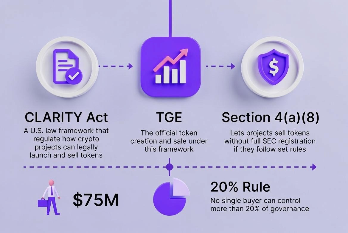 A TGE, or Token Generation Event, under the CLARITY Act is when a crypto project officially creates and sells its tokens while following U.S. legal rules. The law explains how teams can sell tokens in a way that does not break securities laws.