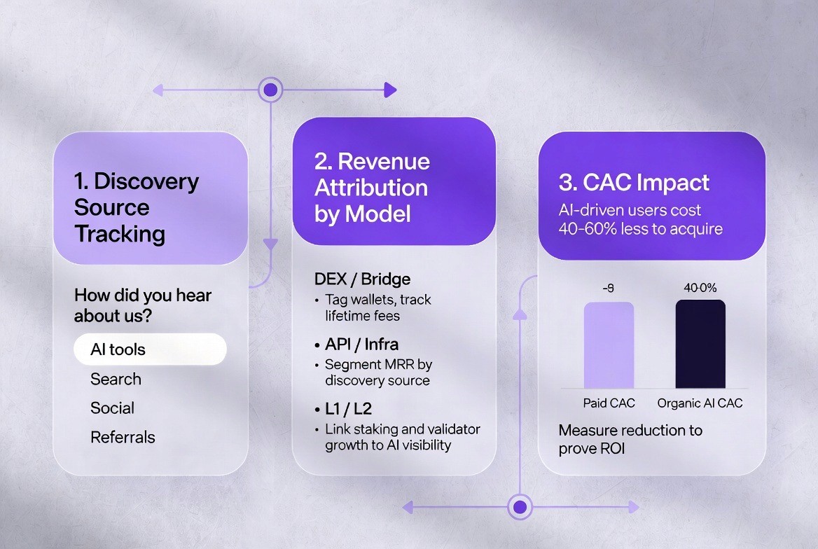 AI visibility must connect to business outcomes. This framework shows how to attribute revenue to GEO/AEO marketing efforts. By linking AI-driven discovery to real actions such as wallet connections, API sign-ups, and enterprise inquiries, teams can measure impact beyond impressions and clicks. This approach turns GEO and AEO from visibility tactics into accountable growth channels tied directly to revenue.