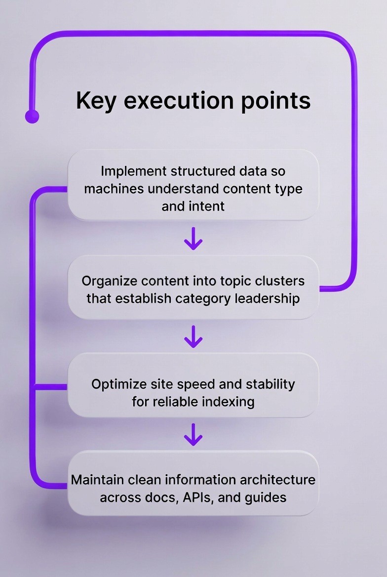 Technical Priority | Page speed, crawlability | Structured data, machine-readable content |