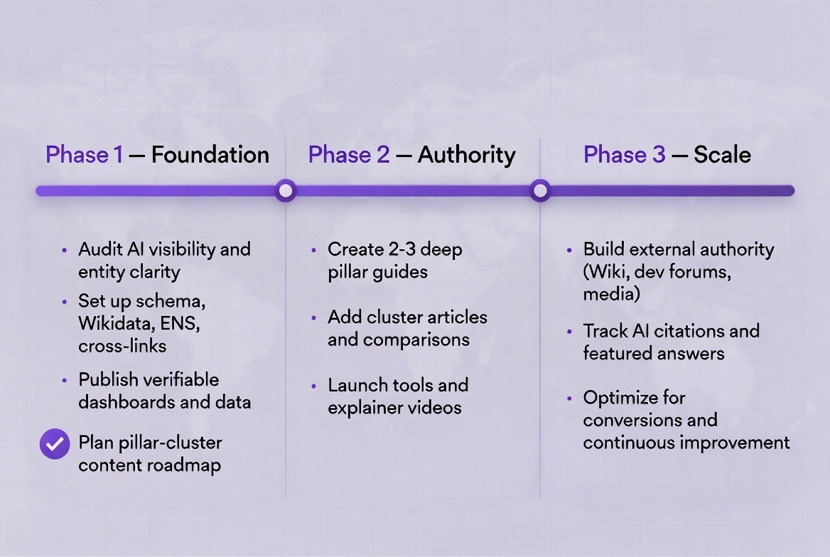 How to implement GEO and AEO for any Web3 project to gain AI visibility through the four pillars of marketing strategy: knowledge authority, entity recognition, data-driven credibility, and technical excellence - incorporating information gain score as a key metric.