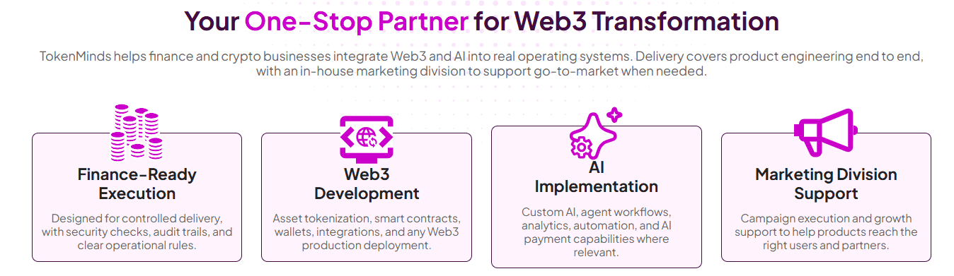 If you have an enterprise AI program that also needs blockchain integration, LeewayHertz covers that stack. If you need a dedicated Web3 team to build a token launch, an AI-blockchain payment system, or a regulated tokenization platform and take it to market, TokenMinds is the stronger fit.