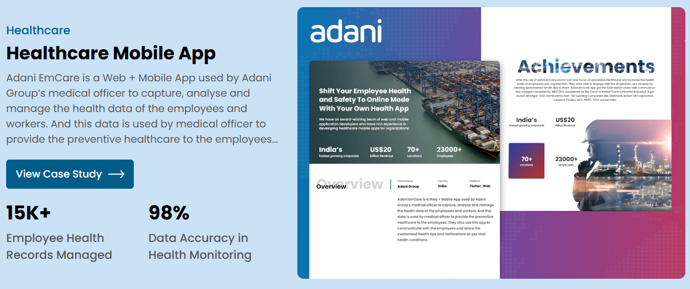 Sapphire Solutions built a web and mobile app for Adani Group's medical officers. The system captures, analyzes, and manages employee health data across the company's operations.