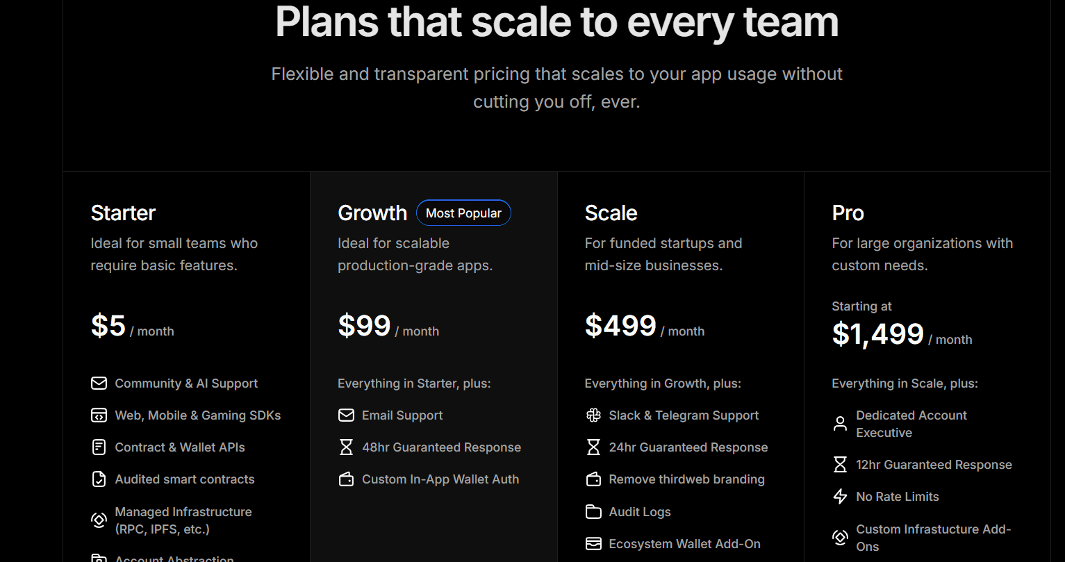 The free tier covers basic contract deployment, SDK access, and up to 1,000 monthly active wallets. The Growth plan costs $99 per month and includes higher wallet limits, priority support, and advanced analytics. The Pro plan is custom-priced for enterprise teams needing SLA guarantees and dedicated support. Individual contract deployments cost gas fees only on the free tier.