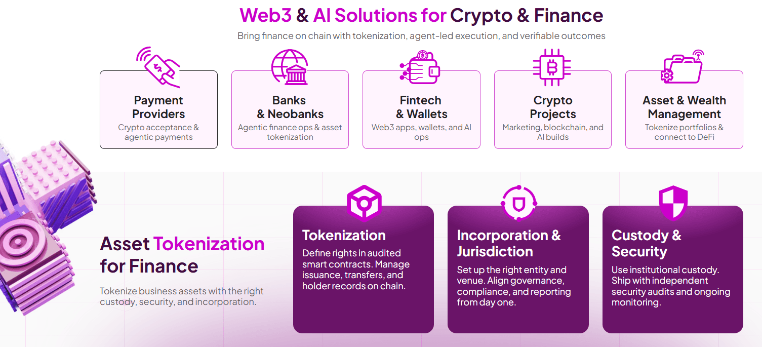 The firm covers the full delivery stack: blockchain strategy, smart contract development and auditing, token generation events, cross-chain payment rails, asset tokenization, and AI-driven treasury management. Every engagement is managed. The client does not need an internal Web3 team to execute.