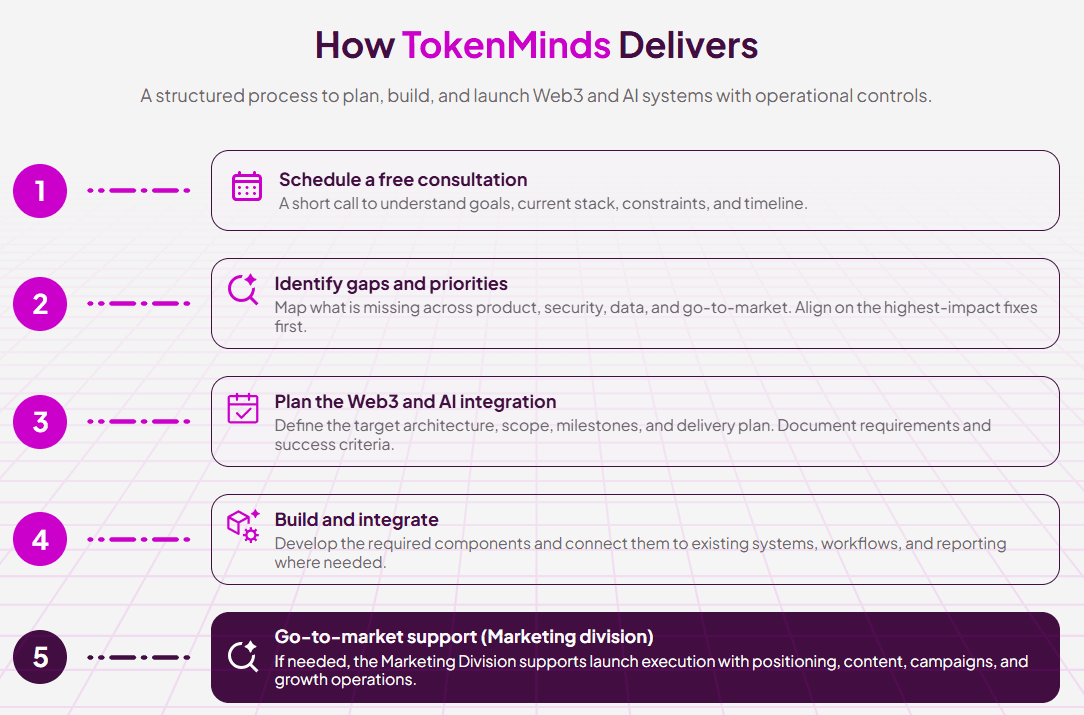 TokenMinds fits enterprises, financial institutions, and protocol teams that need more than tools. They need a partner that owns the outcome. These teams may not have internal Web3 engineers. Or they have engineers but not the specialized expertise for audited token launches, cross-chain payment rails, or regulated asset tokenization.