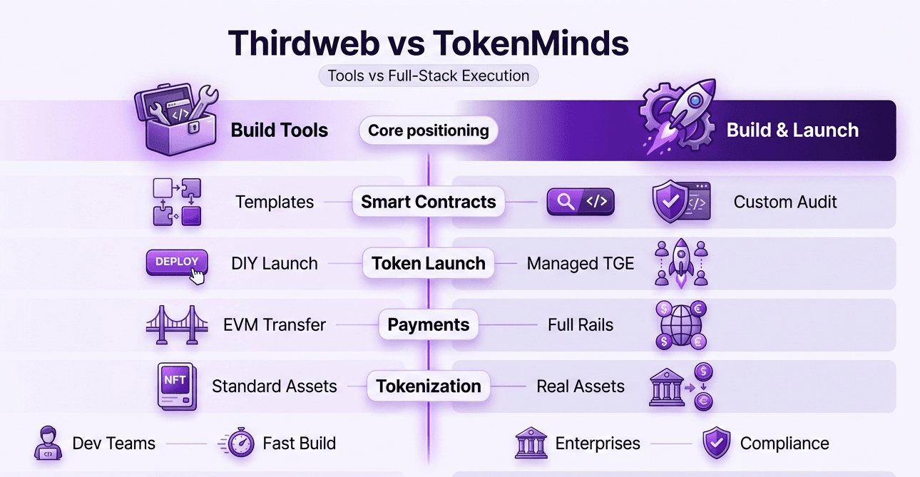 Thirdweb and TokenMinds are not competing for the same client. They operate at different layers of the Web3 stack and serve fundamentally different needs.
