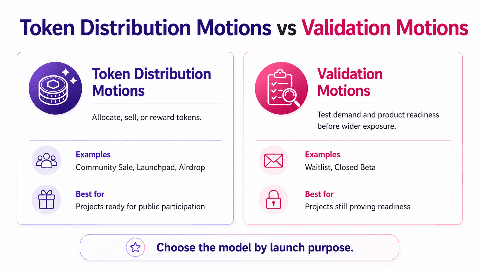 Not every GTM model has the same purpose. Token distribution motions give users token access, allocation, or rewards. Validation motions test demand, intent, and product behavior before wider exposure.